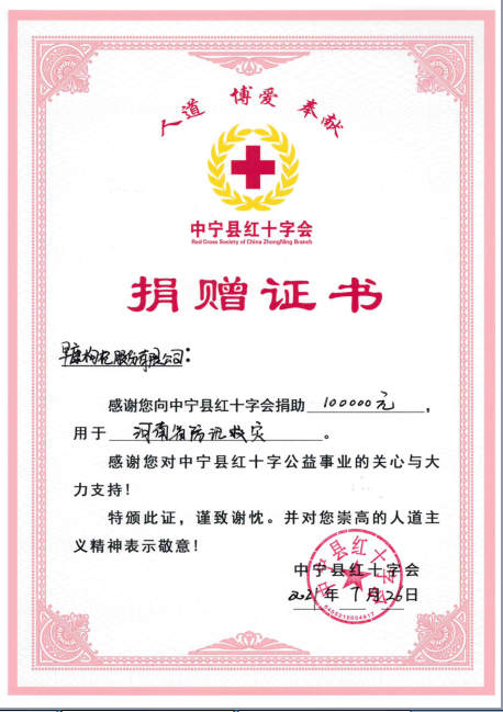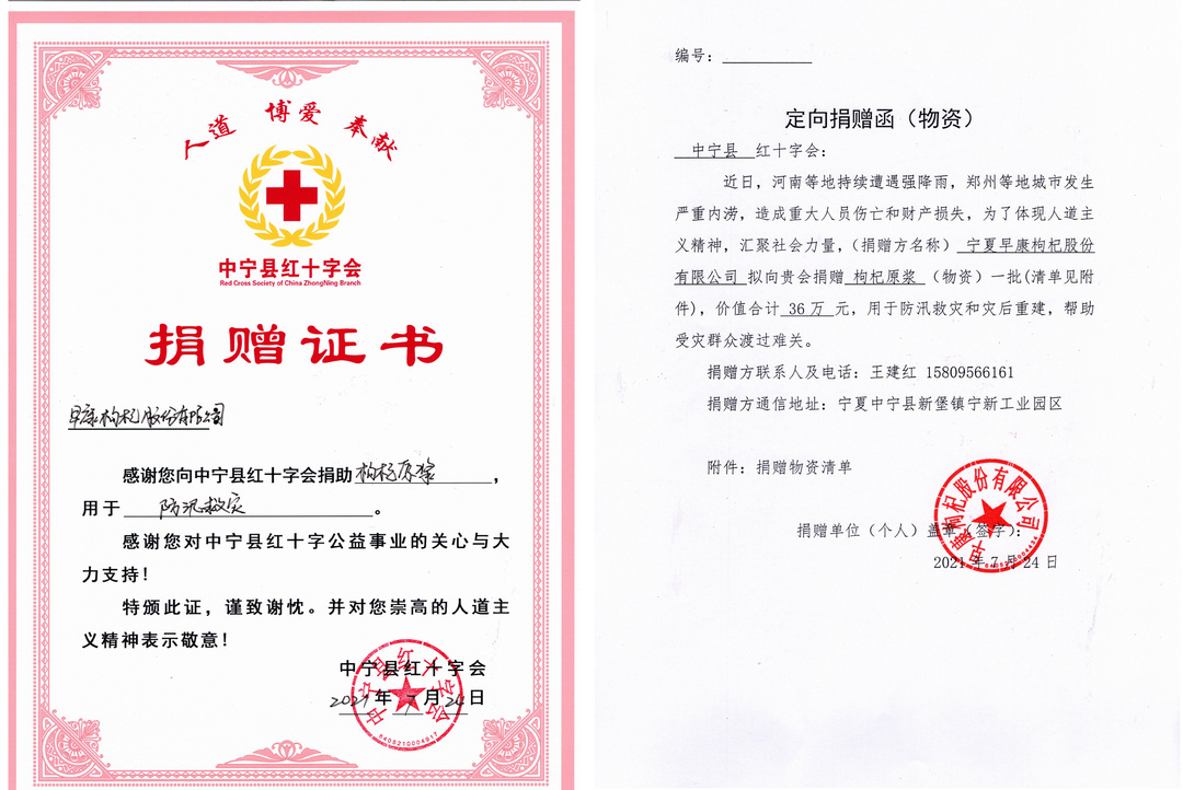 為馳援河南人民對抗暴雨災害,7月24日,早康枸杞向中寧縣紅十字會捐贈價值36萬元物資,用于防汛救災和災后重建。