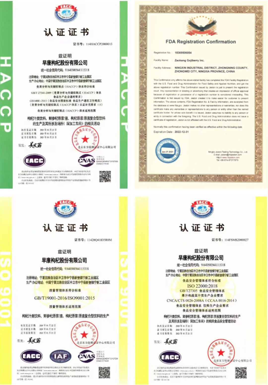 公司產品出口英、日、美、澳、歐盟等30多個國家和地區,早康產品已獲得美國食品和藥物管理局認證,且公司已全面通過HACCP、ISO22000:2018食品安全管理體系,ISO9001:2015質量管理體系認證,憑借先進的生產工藝和嚴格的質量管控,2020年1月被自治區林業和草原局授予“寧夏枸杞行業知名品牌”稱號。